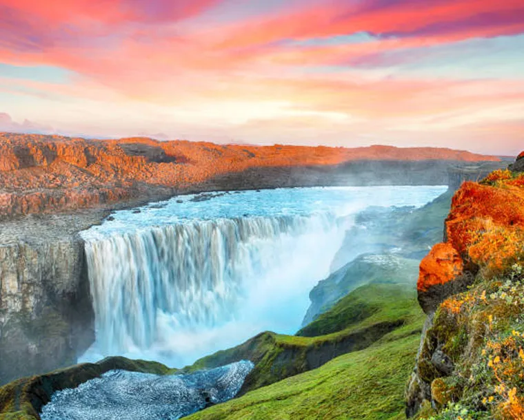 Fed by Langjökull, Iceland’s second biggest glacier, this is one of the most photographed waterfalls in the country. While not the biggest or most majestic, its V shape is unique and powerful to watch. Iceland’s most famous waterfall tumbles 105 feet into a steep-sided canyon, kicking up a wall of spray. On sunny days, the spray creates shimmering rainbows over the gorge. This is a truly amazing spectacle and a rewarding scene after a nice hike.